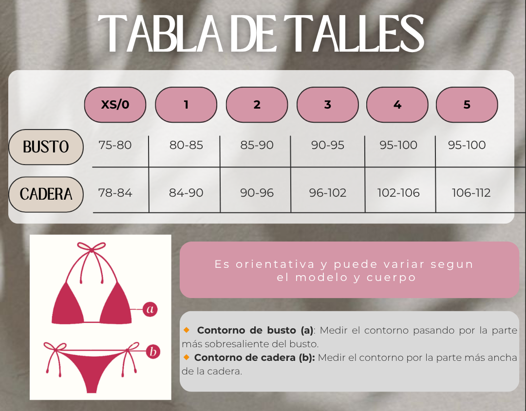 Bikini estilo top deportivo, entero en la espalda y con tiras para atar al cuello. Bombacha colaless con tiras para atar. Tiene abertura para agregar relleno/ almohadita en el corpiño.